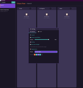 ChaosFlow is a lightweight, keyboard-first Kanban board designed for solo developers, artists, writers, and anyone who wants a calm, distraction-free way to organize their projects. It's fully offline, privacy-respecting, and built to feel smooth, intuitive, and emotionally grounded.